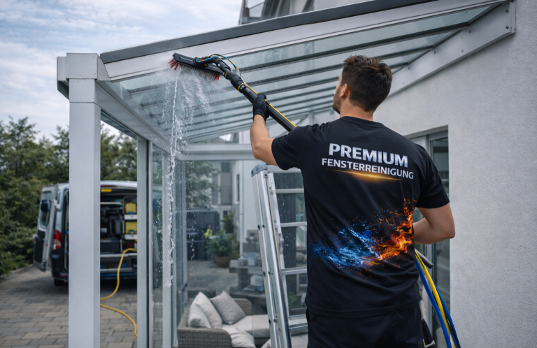 Terrassenüberdachungen aus Glas oder Kunststoff werden mit Heiß-Reinwasser gründlich gereinigt.